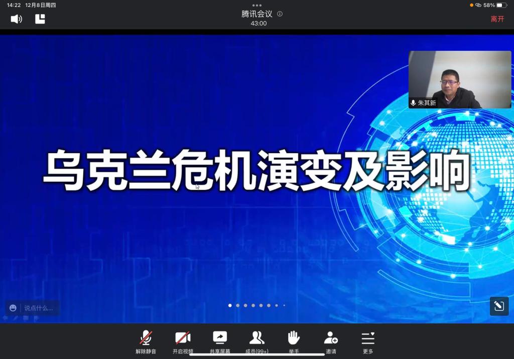 周刚与伯洁老师分别从理论与实践的角度为员工们讲解了《学习贯彻党的二十大精神》与《伟大时代的历史跨越》,通过一系列振奋人心的数字与事例介绍了近十年来发生在祖国的沧桑巨变,引导同学们努力学习、增长才干,为中华民族的伟大复兴贡献青春力量;朱其新老师给大家带来了今年举世瞩目的《俄乌战争危机演变及影响》专题讲解,通过洞悉双方此次开战的背后渊源与对世界格局的影响,帮助同学们打开国际视野,启示青年学子要关注国家安全,自觉做国家安全的守护者;曹自洋与蒋全胜老师选择了《书写”一国两制”实践新篇章》专题,深刻阐明了中国特色社会主义制度的优越性,对提升同学们的民族自信与自豪感颇具效果。