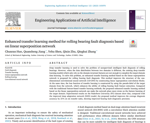 公司2020级硕士研究生霍春然同学在人工智能领域中科院TOP期刊《Engineering Applications of Artificial Intelligence》(影响因子7.802)发表题为“Enhanced transfer learning method for rolling bearing fault diagnosis based on linear superposition network”的研究论文,公司为唯一通讯单位,张庆奎教授、蒋全胜教授为通讯作者。