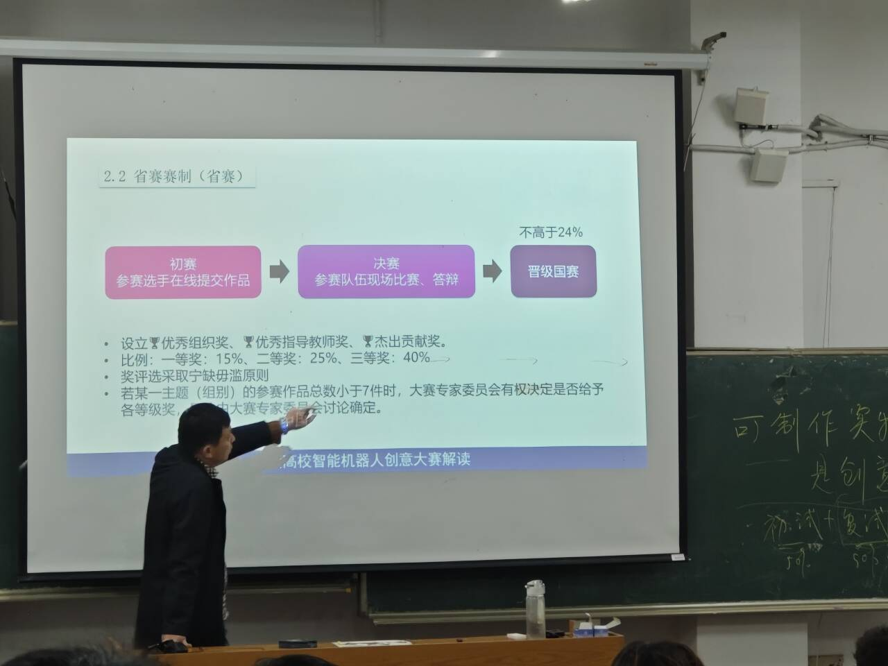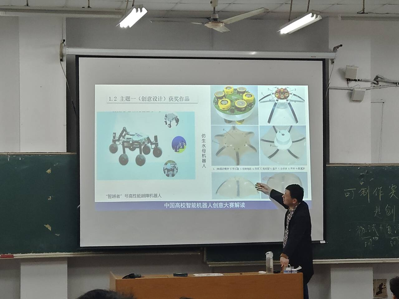 汪老师首先进行了赛事解读,为现场的观众讲解机器人创意大赛的相关赛制、每种主题下所设计的机器人的特点以及作用,还展示了历届优秀的获奖作品。在最后的互动环节中,汪老师针对同学们提出的问题一一给予了解答。同学们参赛热情高涨,纷纷表示会持续关注该赛事,争取在比赛中取得好的成绩。