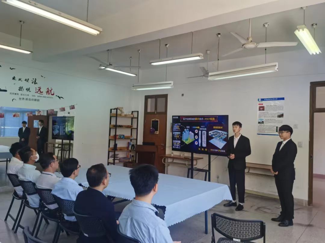 活动过程 ,主持人对比赛流程及评分标准进行了介绍,参赛选手依次上台进行演讲及回答评委老师们提出的问题。比赛分为提交项目计划书、项目PPT演讲展示、5分钟现场答辩三个环节,经过评委点评,专家评审,最终,公司许兵老师指导,詹童欢、刘加豪、周巍三位同学完成的作品《衣芯智检-布基微流体分析装置制造研究》项目脱颖而出,推荐参加校赛。