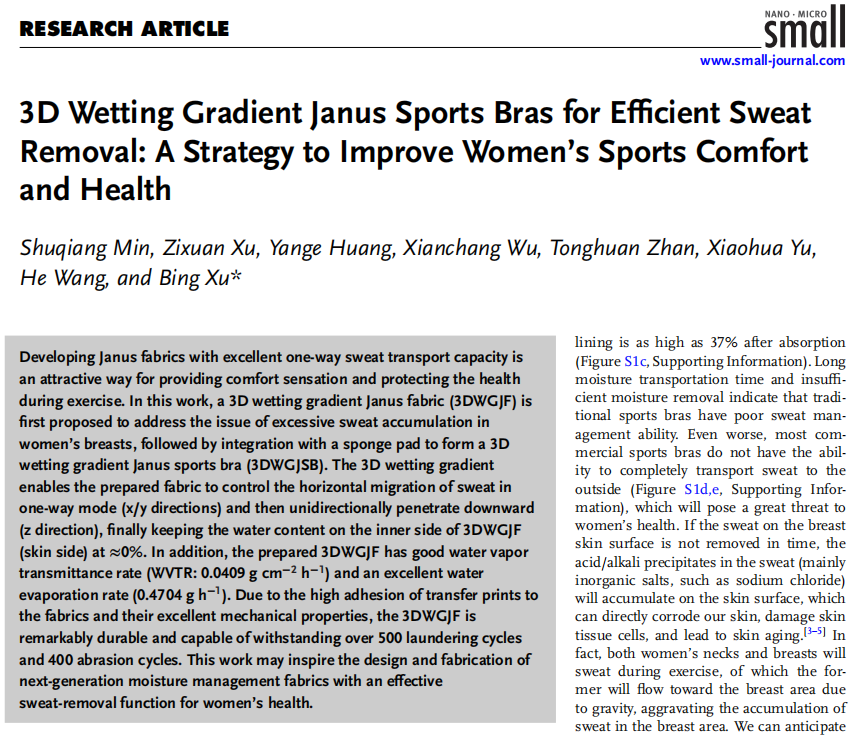 太阳成集团122ccvip2022级硕士研究生闵书强以第一作者分别在国际TOP期刊《Chemical Engineering Journal》(影响因子13.3)发表题为“Mechanical stretching triggered smart Janus fabrics for dynamic personal moisture/heat management”和《Small》(影响因子13)发表题为“3D Wetting Gradient Janus Sports Bras for Efficient Sweat Removal: A Strategy to Improve Women's Sports Comfort and Health”的研究论文,公司为唯一通讯单位,导师许兵副教授为唯一通讯作者。