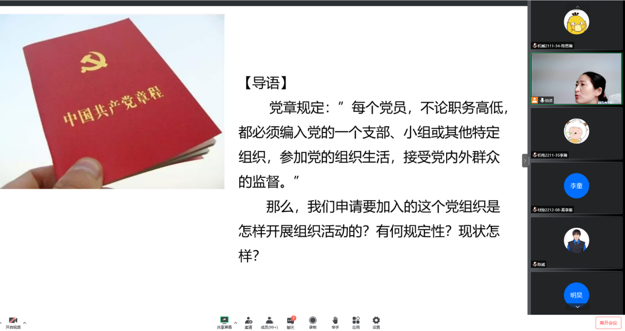伯洁指出青年要全面深刻认识中国和中国共产党,客观理性审视世界,把崇高的理想和坚定的信念结合起来,把个人的理想信念与社会的理想信念结合起来,树立远大理想,不断提升自我思考的能力,以己之小我融入国之大我。随后,伯洁重点讲述了申请发展党员的工作的流程,要求新生们要认真学习党的历史,加深对党的理解与认同。同时也指出了党组织对于新党员的培养是一个漫长而深刻的过程,想要加入中国共产党必须要接受党组织的考验。