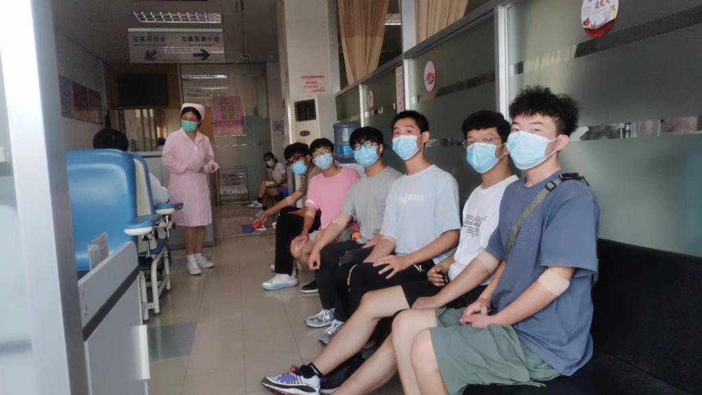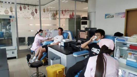 9月10日清早,由辅导员顾春望组织14位献血志愿者分批来到苏州大学第一附属医院与陈梦杰姐姐汇合一同来到苏州中心血站。员工经体检化验后,李健钊捐献一治疗单位血小板,郭宇同等11位捐献300cc全血。