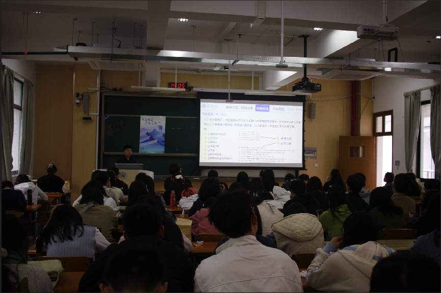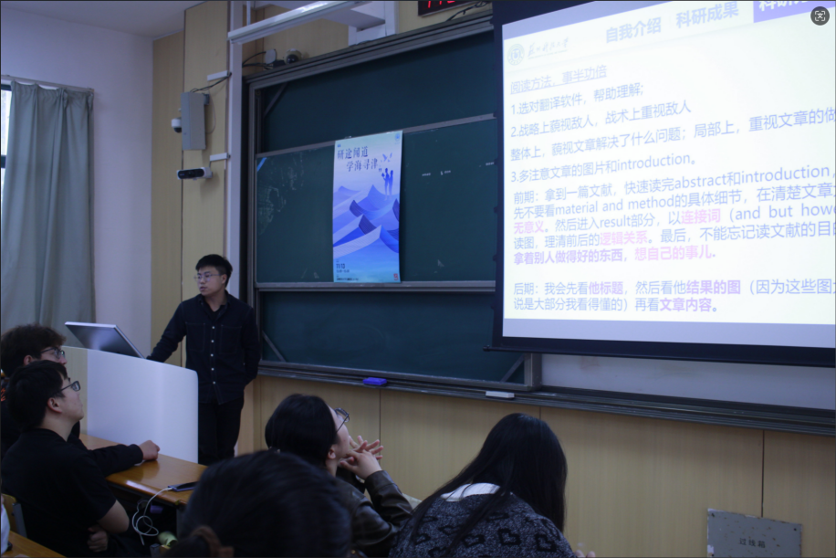 本次学术分享会邀请到了闵书强同学。他的代表性成果:共发表二区SCI论文4篇,其中1篇一作,2篇二作。主持撰写省创;获得2023,2024国家奖学金、2022、2023研究生一等奖学金、2022、2023优秀研究生等荣誉。随后他从自身角度出发,通过分享自己在专业方面的探索历程,从找论文、读论文、做实验、写论文几个方面出发,为同学们分享了自身的科研经验,并分享了他在研究过程中遇到的挑战以及解决问题的方法。其幽默风趣的语言把分享会的氛围推向高潮,教室里不时响起欢声笑语。学长精彩的解读、坦诚的分享,为学弟学妹们提供了不少有价值的参考信息。在问答环节,闵书强同学耐心解答,现场气氛十分活跃。通过闵书强同学的分享,同学们对科研生活有了更深的理解,也激发了对未来学习方向的思考。