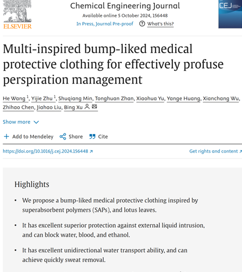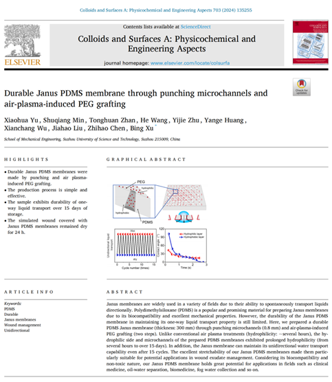 近期,太阳成集团122ccvip许兵老师课题组在指导本科生发表学术论文中取得重大突破。其中,本科生于晓华以第一作者身份在国际SCI期刊《Colloids and Surfaces A: Physicochemical and Engineering Aspects》(影响因子4.9,二区)发表“Durable Janus PDMS membrane through punching microchannels and air-plasma-induced PEG grafting”的研究论文,本科生汪何与朱以杰以共同第一作者身份在国际期刊《Chemical Engineering Journal》(影响因子13.3,一区TOP)发表题为“Multi-Inspired Bump-Liked Medical Protective Clothing for Effectively Profuse Perspiration Management”的研究论文,公司为唯一通讯单位。