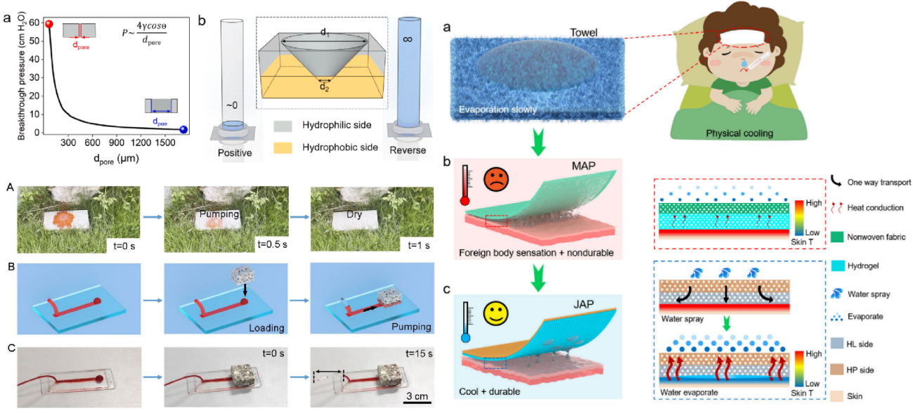 本科生刘加豪与陈志浩以共同第一作者的身份,在国际顶尖期刊《ACS Applied Materials & Interfaces》(中国科公司二区,影响因子高达8.3)上发表了题为“Janus Antipyretic Pastes for Efficient, Durable and Comfortable Personal Physical Cooling”的研究论文。该研究创造性地反转Janus织物单向导湿特性,并将其巧妙融入退烧贴设计中。结合工程智慧,他们还设计了一套外部供水系统,这一创新不仅大幅提升了退烧贴的降温效率与持久性,更确保了佩戴过程中的极致舒适度,为发热患者提供了更加安全、舒适的物理降温方案。